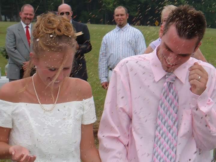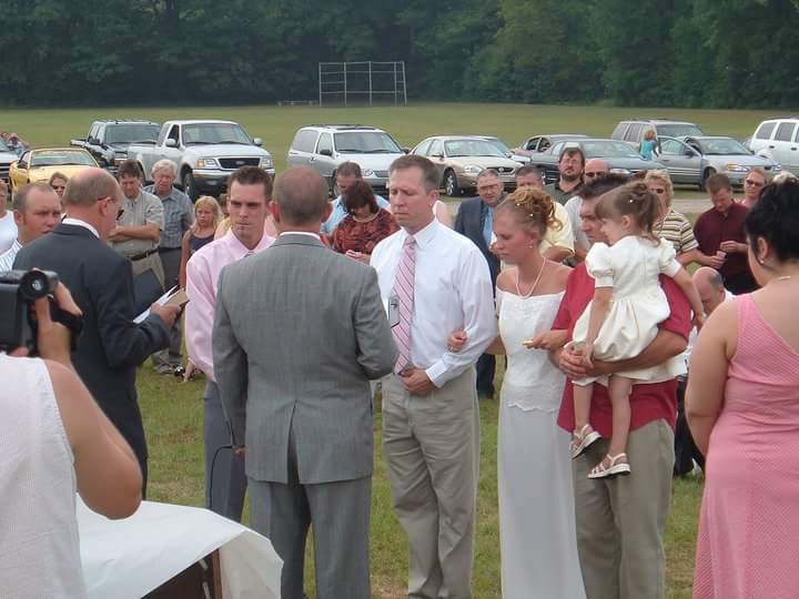 Our wedding day was so hot! It actually rained that morning and I was so worried that our day would be ruined. D (my wonderful hubby) and I fought all week. I know it was probably cold feet presenting itself in arguments, but it was a beautiful day. We went out to breakfast at a great place called Farmer’s Inn. I ordered my favorite grilled sunflower toast and was so nervous that I just picked at it. While my hair was in curlers, I walked around, practiced my vows and prayed that God would settle my nerves and give me peace. In an absolute miracle, by the time it was time to start, I was so excited! We had our wedding outside at our church campground where it all started. We set up a beautiful aisle way with a table and flowers. It looked great! (And super low budget) I finally started my journey down the aisle with my dad, about halfway down the way, I picked up my step dad, so they both walked me the rest of the way.